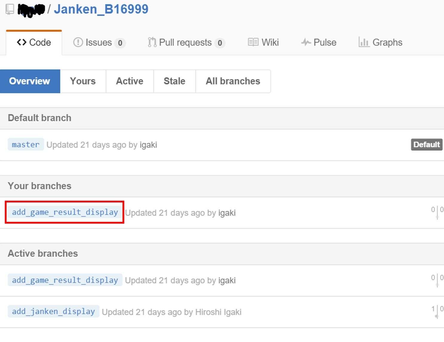 - Push完了後に,GitHub上のリポジトリページから「3 branches」(ブランチの数)というリンクをクリックすると,現在GitHub上のリポジトリにpushされているブランチの一覧を見ることができるので,