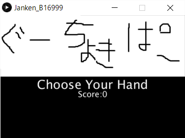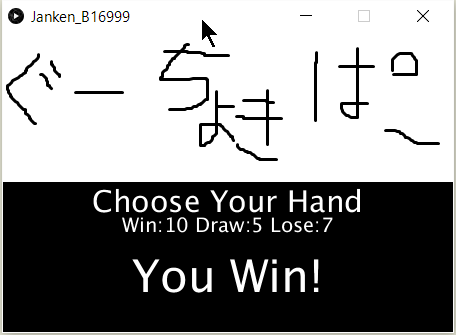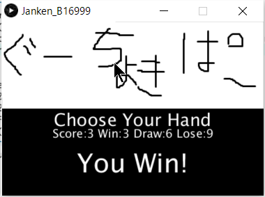 add_total_scoreに切り替えた後,Processingからプログラムを実行し,下図のように勝ち,引き分け,負けが正しく表示されることを確認する.- Processing IDEからJanken_学生番号.pdeを実行すれば良い.