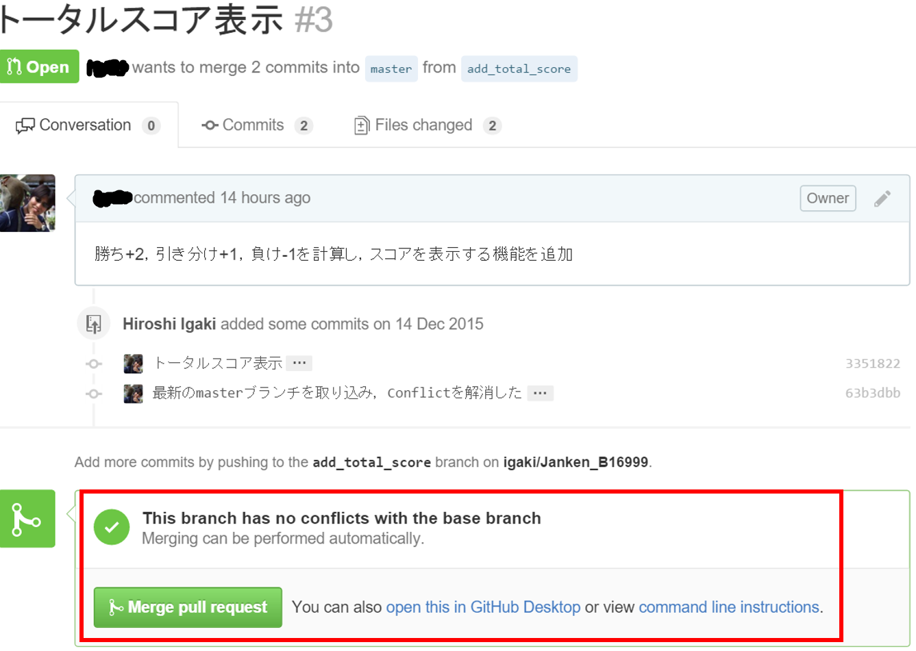 add_total_scoreブランチで開発した内容を確認してmainブランチに統合してください」というリクエストを共同開発者から主開発者に対してGitHubを介して送るためのものである.主開発者はGitHubのリポジトリページを開き,