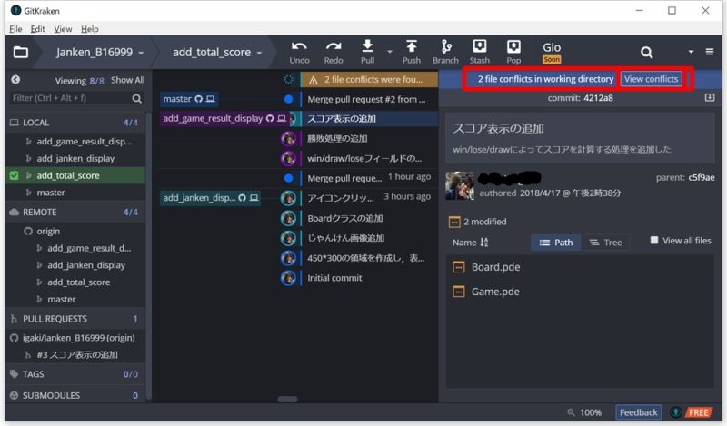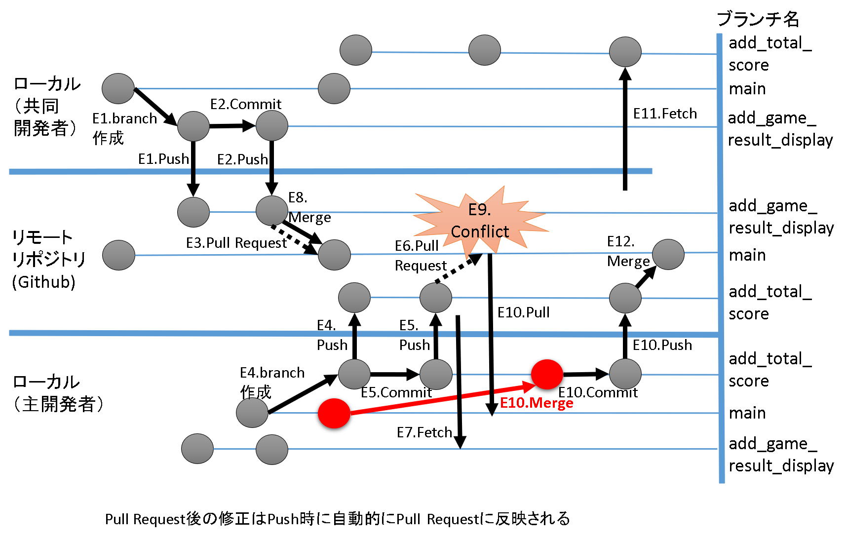 このConflictはadd_total_scoreの修正内容が直前にCommit/Pushされたadd_game_result_displayブランチの修正内容と重なってしまったために発生している.この演習ではわざと行ったが,実際の開発においても同様の状況が発生することは十分に考えられる.
