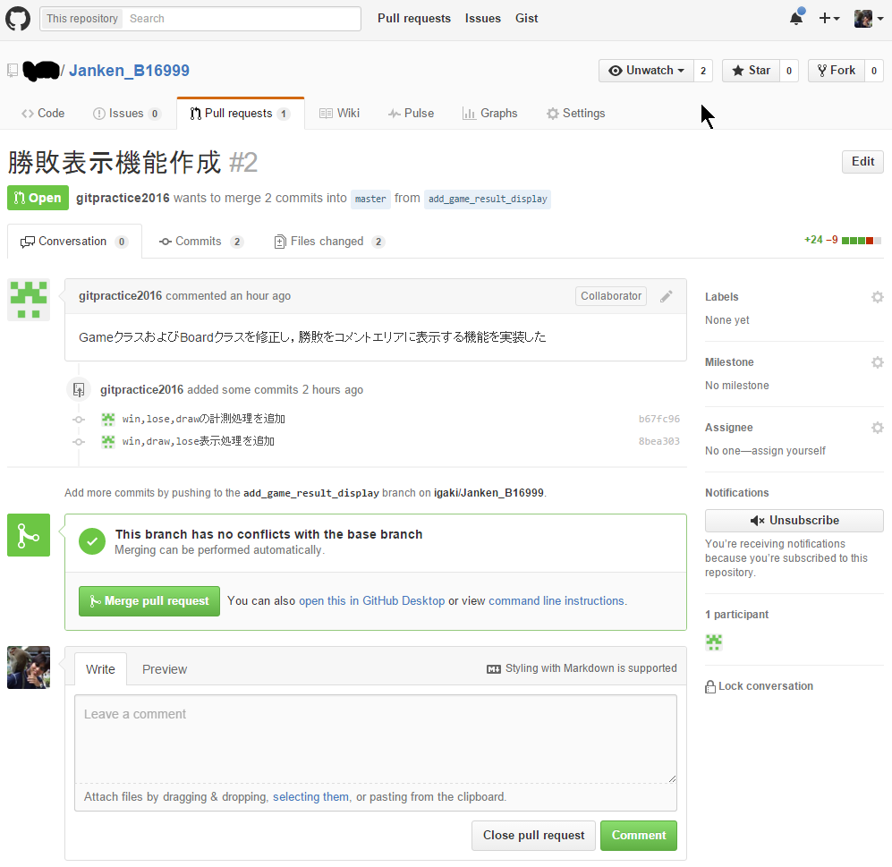 add_game_result_displayブランチで開発した内容を確認してmainブランチに統合してください」というリクエストを共同開発者から主開発者に対してGitHubを介して送るためのものである.共同開発者はGitHubのリポジトリページを開き,