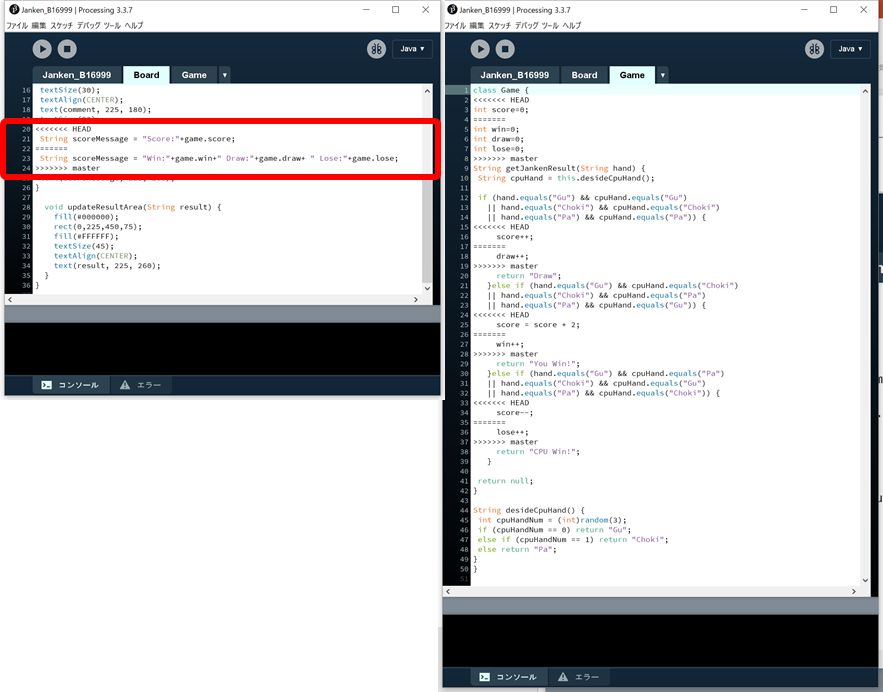 mainブランチを表示(checkout)し,[Pull]ボタンをクリックする. mainブランチを「Pull」した後,Processingからプログラムを実行し,下図のように勝ち,引き分け,負けが正しく表示されることを確認する.- Processing IDEからJanken_学生番号.pdeを実行すれば良い.