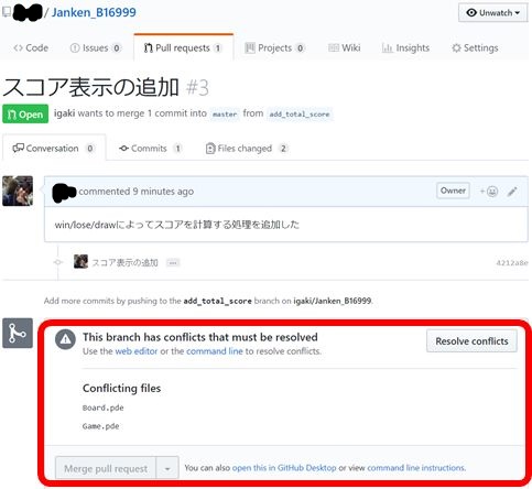 この時点で残っているPull Requestは主開発者によってE6で作成されたスコア表示機能(add_total_scoreブランチ)のみになり,そのPull RequestをGitHubのリポジトリページから表示させると下記のようにConflictが検知される.このままではレビュー及びMergeができないため,Pull Requestのコメントとして,Conflict(競合)が発生していること記述し,主開発者に伝える.