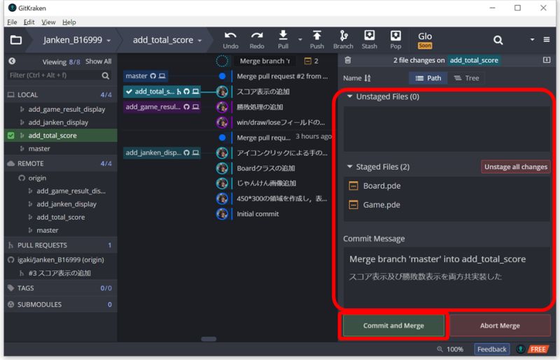 GitKraken上でブランチをadd_total_scoreにした状態で,「スコア表示」機能を主開発者が実装する.ここでは,Gameクラスのフィールド及びgetJankenResult()メソッドとBoardクラスのupdateCommentArea()メソッドを修正する.詳細な実装内容を下記に示す.
