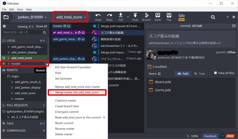 mainブランチの内容をadd_total_scoreブランチにMergeする. - 下図のようにまずGitKraken上で