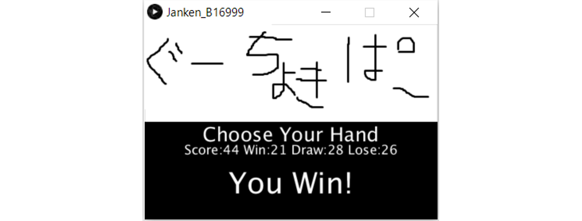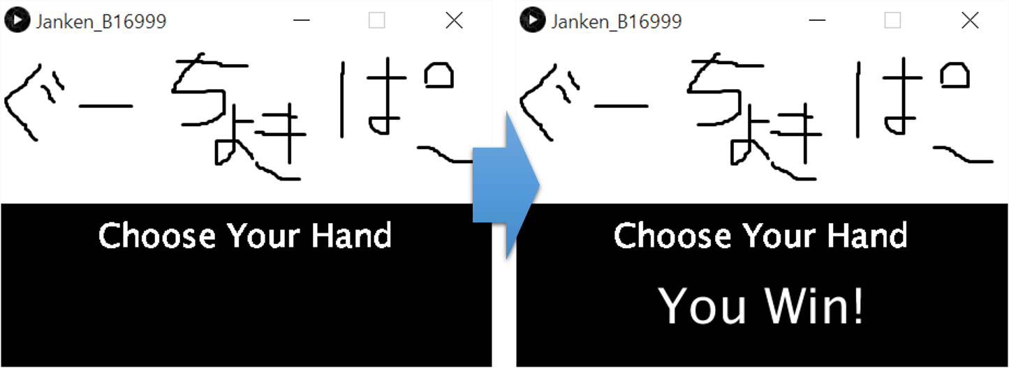 じゃんけんゲームはユーザがCPUとじゃんけんをするゲームである.実装言語はProcessingを想定している. 下図左が起動時の画面となっており,この画面でユーザが「ぐー」,「ちょき」,「ぱー」のいずれかを選択(クリック)すると下図右のようにCPUとじゃんけんが行われ,判定結果が表示される.