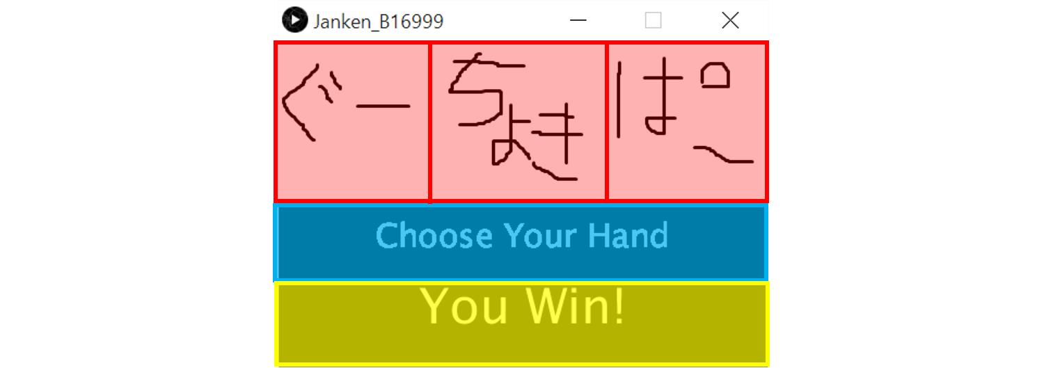 ゲーム画面は下図のとおり,赤で示している選択エリア,青で示しているコメントエリア,黄色で示す結果表示エリアの3種類から構成される.選択エリアにはユーザが選択するじゃんけんの手が表示されており,コメントエリアには「Choose Your Hand」と表示される.結果表示エリアにはユーザの勝ち(You Win!),負け(You Lose!),引き分け(Draw)の3種類のメッセージがCPUとのじゃんけんの結果として表示される.