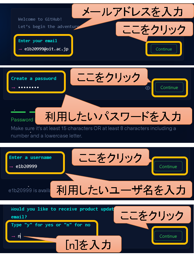 ここで,ユーザ名は既存のものと被っていなければ何を使ってもよい(アルファベットといくつかの記号のみ).メールアドレスについても,自分でメールがすぐに確認できるものであれば何を使ってもよい.パスワードについてはGitHubの仕様(7文字以上,小文字が混ざっている,数値が混ざっている)を満たしていれば何を利用してもよい.なお,演習実施時には他のチームメンバ及び教員にユーザ名を公開すること.