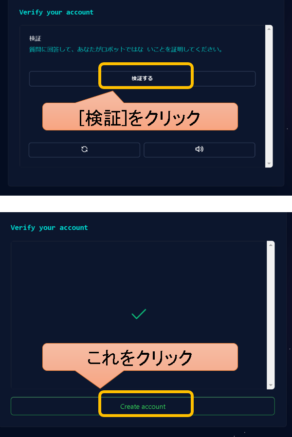 - A7. 検証が終われば[Create account]ボタンをクリックする.