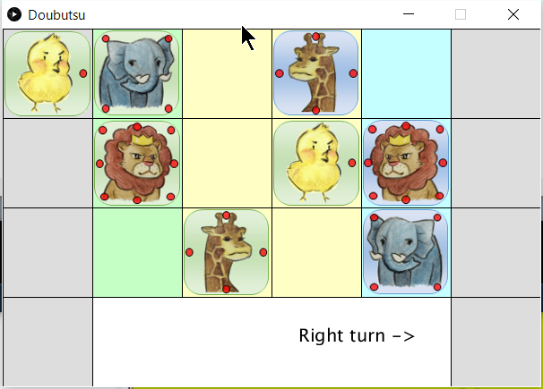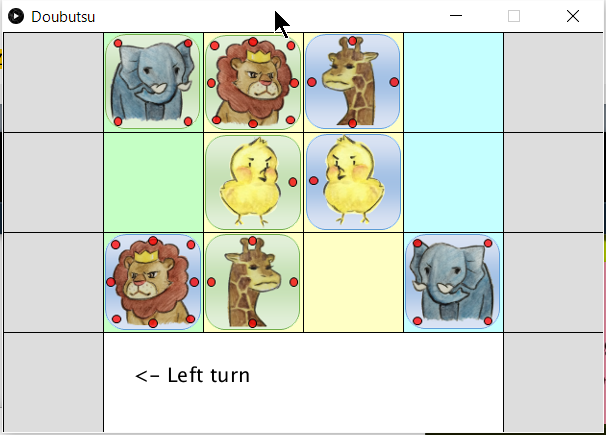 select()メソッドが↑になっているかを確認する - プログラムを実行し,下図のようにコマが移動できるかとLeftの手番が終わったら(コマが移動できたら),Right側のコマが移動できるようになることを確認する